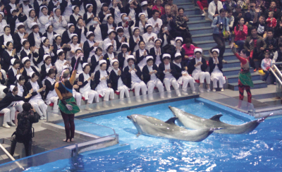 “5·12”国际护士节,大连老虎滩海洋公园联合大连大学附属新华医院、大连市护理协会举行了以“关爱白衣天使,畅游神奇虎滩”为主题的精彩专场演出,现场有上百名护士参与活动,观看了一场异彩纷呈的极地海洋动物表演,还有精彩的海洋动物互动环节。记者看到,白鲸也为医护工作者带来了节日的问候,不时吐圈圈与“白衣天使”亲密互动,并为其热情地献吻。同时, “5·12”国际护士节当天,新华医院的医护工作者为游客带来义诊服务。