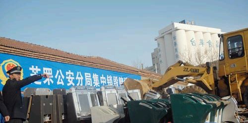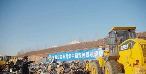 昨日上午,芝罘公安分局在地方港附近一仓库院内举行年内第二次大规模集中公开销毁赌博机活动。随着两台碾道车和挖掘机的轰鸣声,453台赌博机、733张赌博机电路主板顷刻间化为碎片。